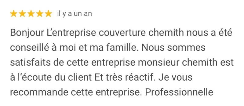 Couverture chemith est une entreprise familiale père et fils fondée il y a plus de 15 ans. Notre équipe d'artisans qualifiés met tout en œuvre pour garantir la satisfaction de nos clients. Nous sommes fiers de notre expertise et de notre réputation dans la région.